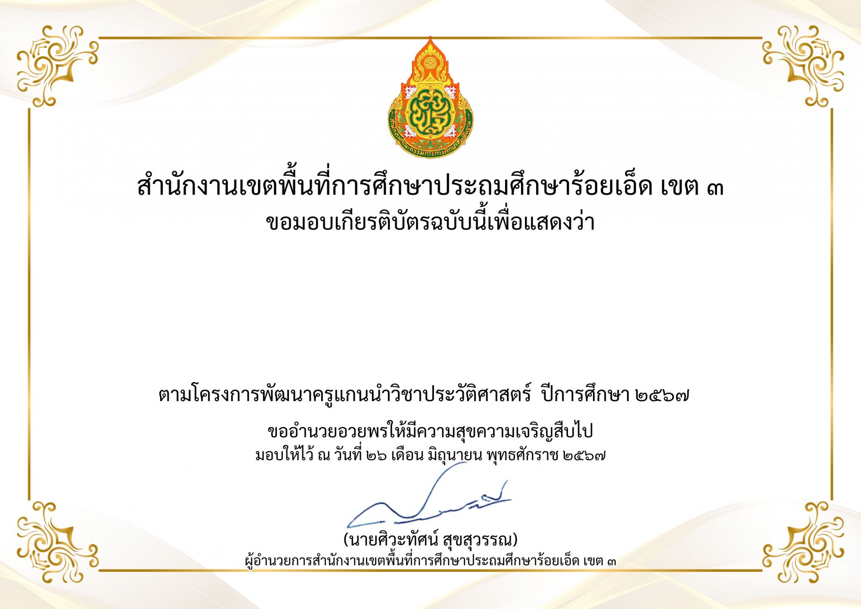 เกียรติบัตรการอบรมเชิงปฏิบัติการเพื่อพัฒนาครูแกนนำวิชาประวัติศาสตร์ ปีการศึกษา ๒๕๖๗ |