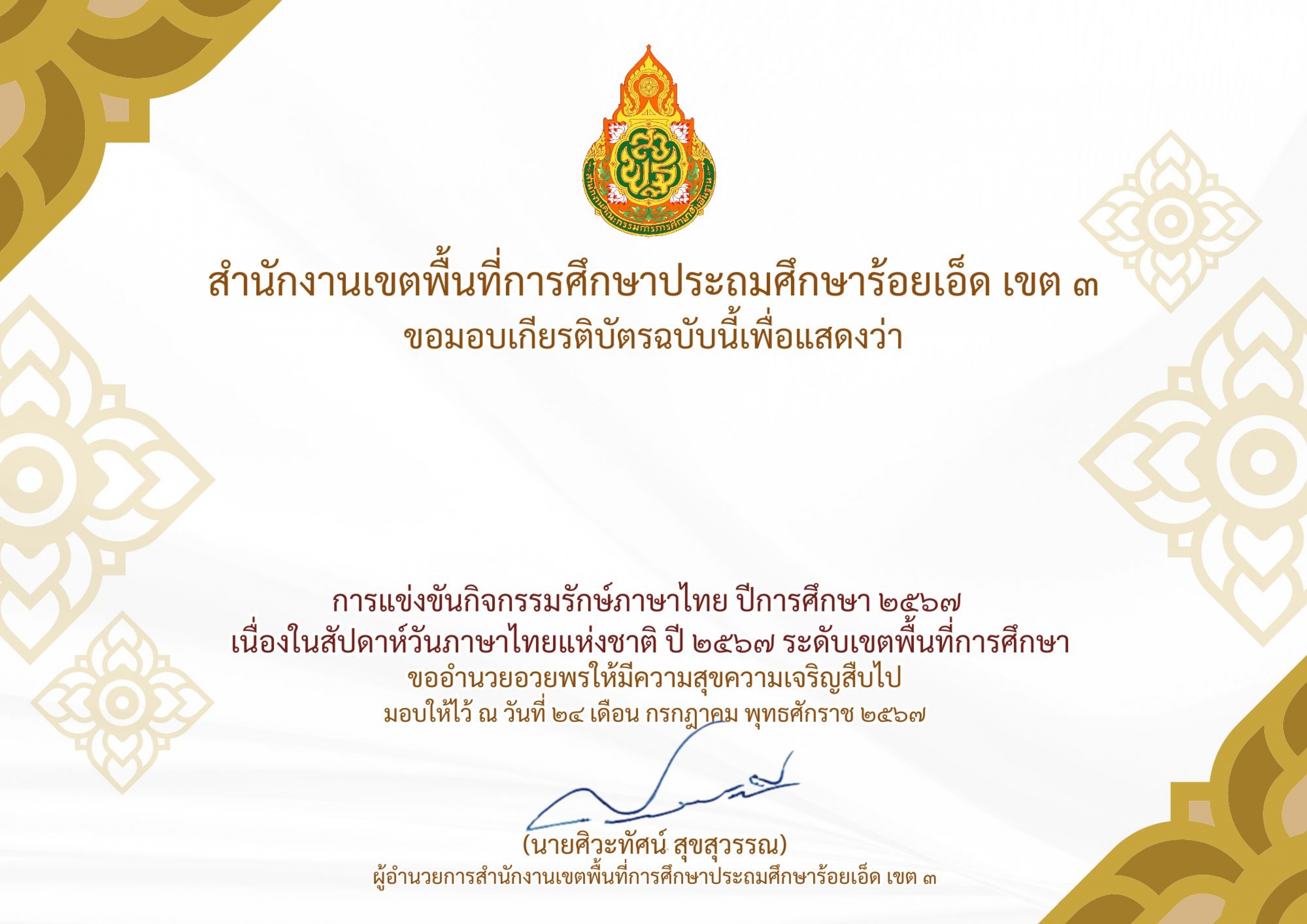 เกียรติบัตรการแข่งขันกิจกรรมรักษ์ภาษาไทย ปีการศึกษา ๒๕๖๗ |